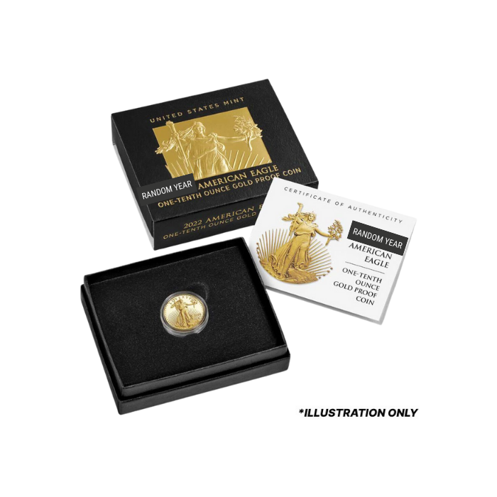 Today, SD Bullion offers 1/10 oz American Gold Eagle Proof Coins housed in an original mint box with a Certificate of Authenticity. They may be of varied mint years, randomly selected at the time of shipping.