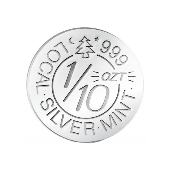 The inscriptions on the center describe the round’s weight through “1/10 OZT.” The information encircling it refers to the mint’s name, imprinted as “LOCAL SILVER MINT,” and the round’s purity of “999.”