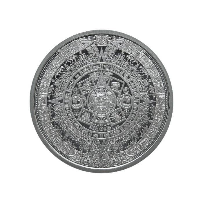 The obverse has a stunning depiction of the famous Aztec Calendar stone. Tonatuih, the Aztec sun god, is shown on the stone. Three separate rings surround the face, each containing images from Aztec history.