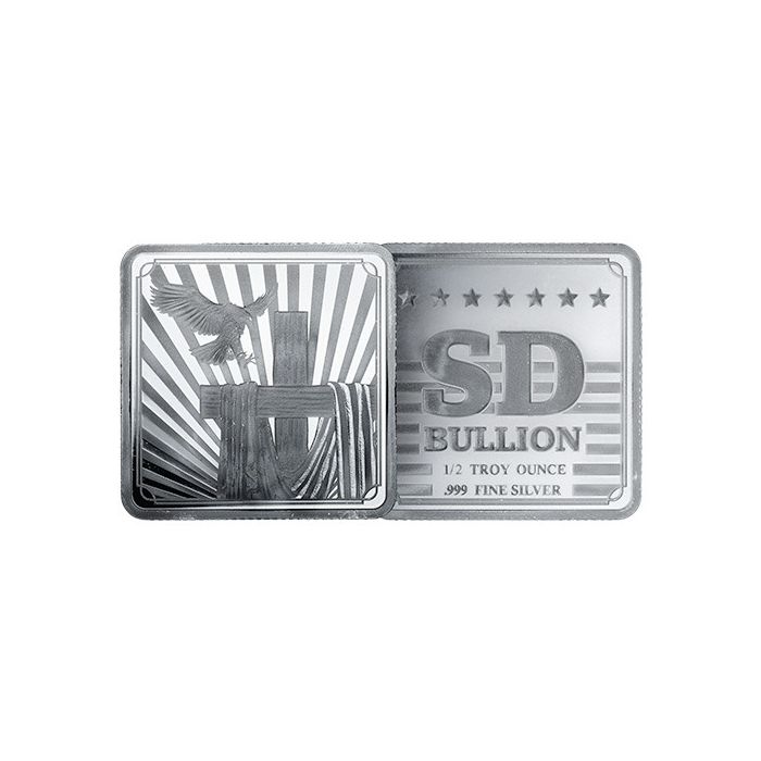 The 1/2 oz SD Bullion Cross and Flag Square Silver Bar is exclusively found at SD Bullion.