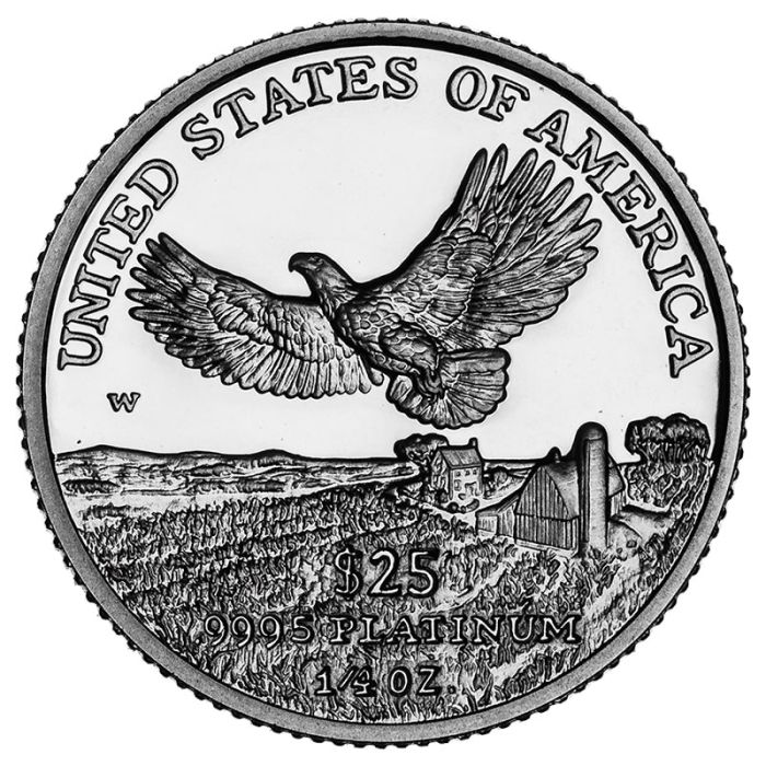 The W mint mark for the West Point Mint is present in all the variations of the reverse design, along with the inscription “UNITED STATES OF AMERICA,” the face value of $25, the weight “1/4 oz.”, and the platinum content “.9995 PLATINUM.”