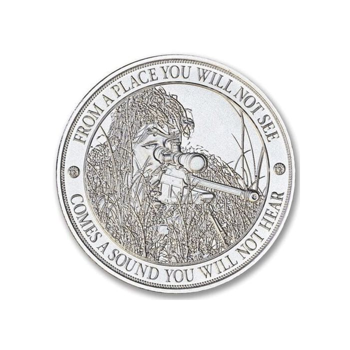 The obverse showcases a sniper in action, hidden in the foliage, while peering into his scope. The image is encircled by the inscription “FROM A PLACE YOU WILL NOT SEE” and “COMES A SOUND YOU WILL HEAR,” separated by two shell headstamps. Incused dentils surround the outer rim.