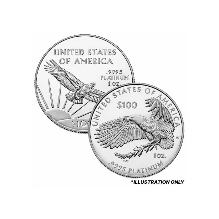On the reverse, Thomas D. Roger displays a flying Eagle as the sun rises in the background. The inscriptions accompanying the image read “UNITED STATES OF AMERICA,” “.9995,” “PLATINUM,” “1 oz,” and “$100”.