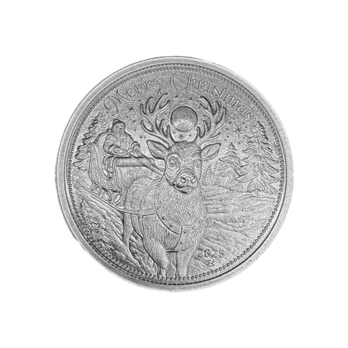 The obverse captures a heartwarming Christmas scene featuring Santa Claus and Rudolph soaring through a snow-filled sky on Christmas Eve. The words “Merry Christmas” curve gracefully above the design, while the year 2025 appears along the right edge.
