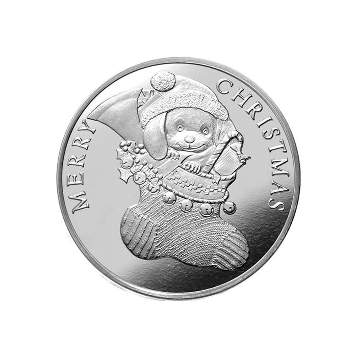 The obverse showcases a cute puppy wearing a Christmas cap inside a decorated stocking along with other gifts. The inscription “MERRY CHRISTMAS” flanks the image.