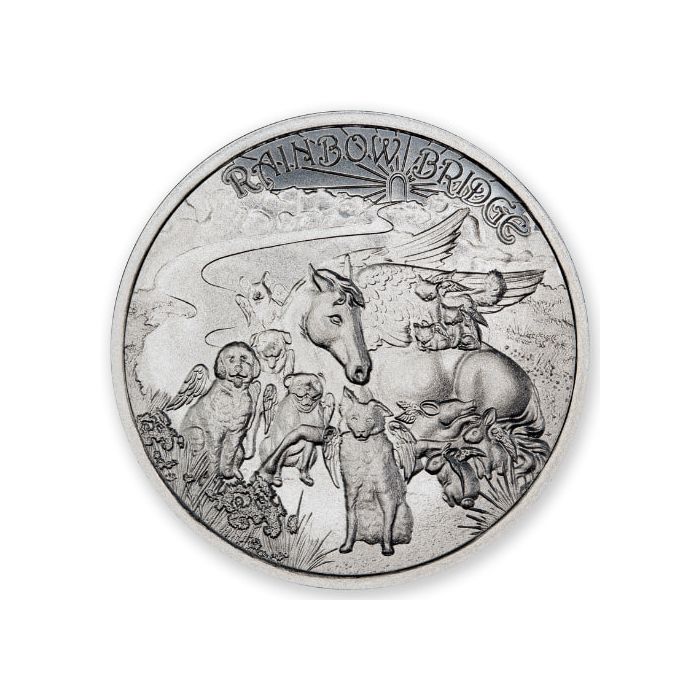 The obverse features several pets surrounding a horse amid meadows and hills. The only inscription on this side refers to the round’s name, “RAINBOW BRIDGE.”