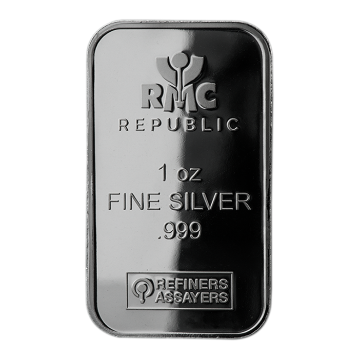 The obverse side highlights the famous RMC logo, with the word ‘Republic’ inscribed under it. This is closely followed by the weight and purity of the silver in the bar, i.e. ‘1 oz Fine Silver .999,’ and displays the assayer’s mark ‘Refiners Assayers’ at the bottom.