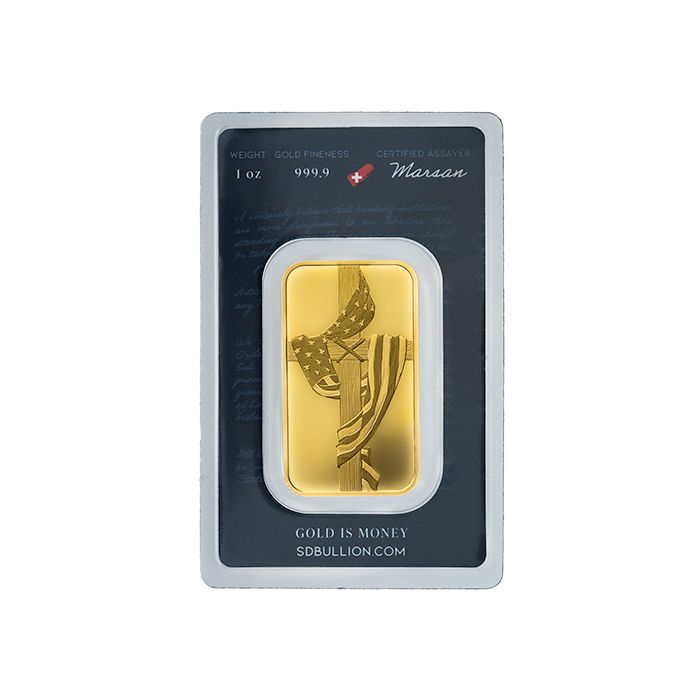 Shop the 1 oz SD Bullion Cross and Flag Gold Bar online, 24/7, exclusively at SD Bullion.