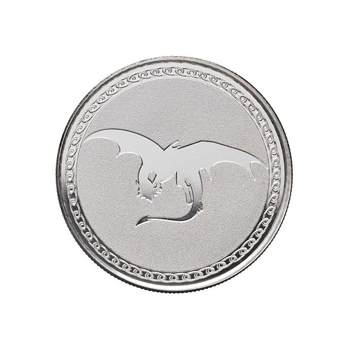 The reverse presents the striking silhouette of a dragon in flight, wings spread wide as it soars across the field. The design is framed by a decorative circular border, enhancing its visual appeal and lending a mythical, collectible charm to the round.