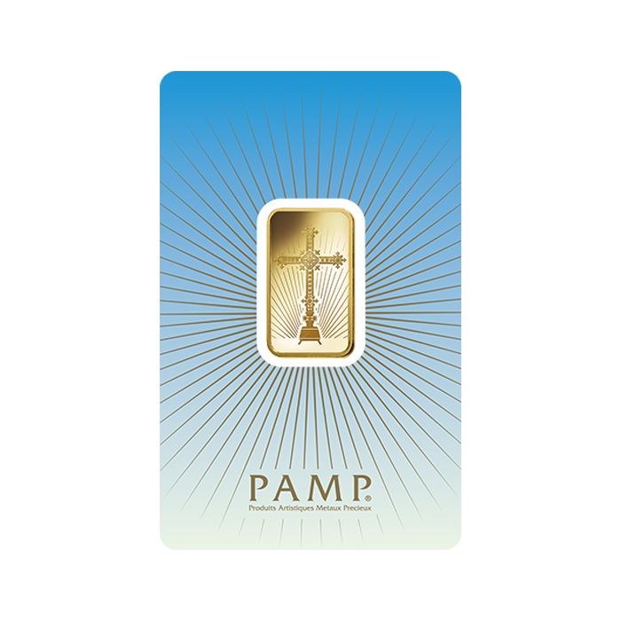 Part of the series that honors every major world religion, the 10 g PAMP Suisse Faith Series Romanesque Cross Gold Bar celebrates Christianity.
