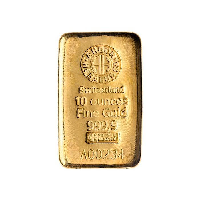 Purchase the 10 oz Argor-Heraeus Cast Gold Bar online from SD Bullion.