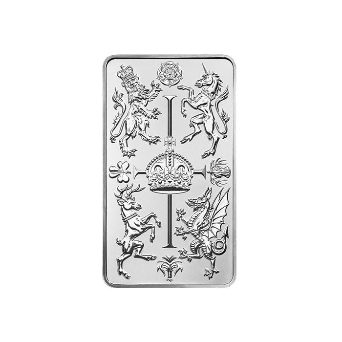 Frosted and polished finishes provide these silver bars with an exuberant visual. Like minted ingots, they have rounded edges, carefully crafted images, and smooth surfaces. The Royal Mint logo and name are on top, followed by a crowned cipher of King Charles III. It is valid to mention that the crown engraved corresponds to the Tudor Crown reproduction.