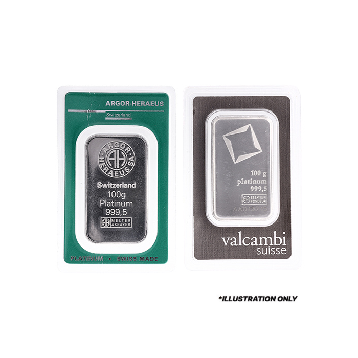The Platinum bars offered weigh 100 grams and are crafted by reputable refineries worldwide. They have a minimum purity of 99.95%.