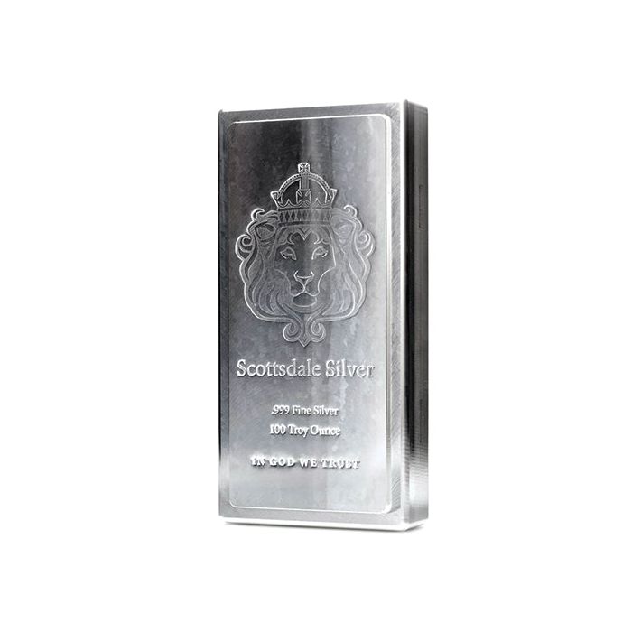 The engravings on the obverse side are delicately carved, and the surface is highly reflective. It features the crowned lion, a trademark of the company, followed by the mint’s name, the bar’s purity, metal content, and weight, through “Scottsdale Mint,” “.999 Fine Silver,” and “100 Troy Ounce.” On the bottom, read the sentence "IN GOD WE TRUST."