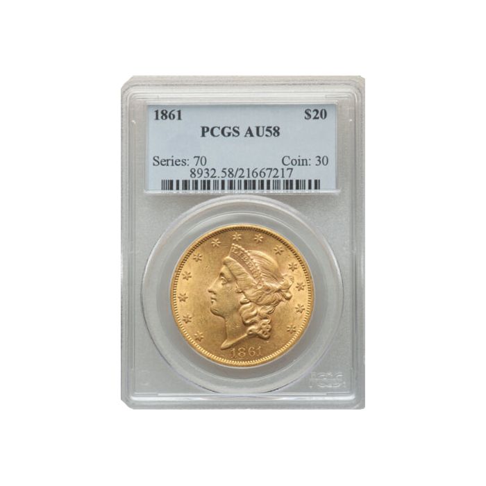 Today, SD Bullion has 1861 $20 Liberty Double Eagle Gold Coins in stock, sealed and certified by PCGS as AU-58 coins.