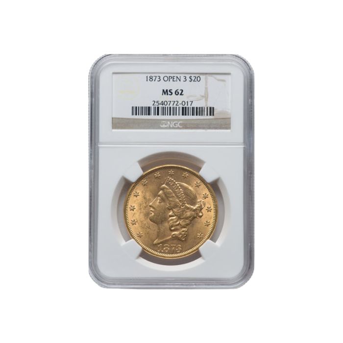 Today, you can purchase 1873 $20 Liberty Double Eagle Gold Coins from those imprinted with an Open 3, sealed and certified by NGC MS-62 samples, at SD Bullion.