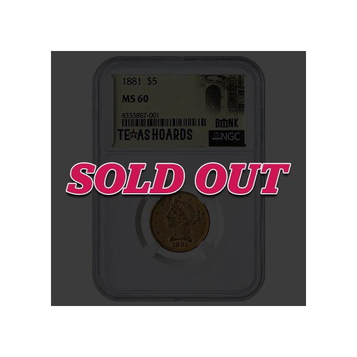 At SD Bullion, you can purchase 1881 $5 Liberty Half Eagle Gold Coins, graded as MS-60 and sealed with the NGC Texas Hoards Label.