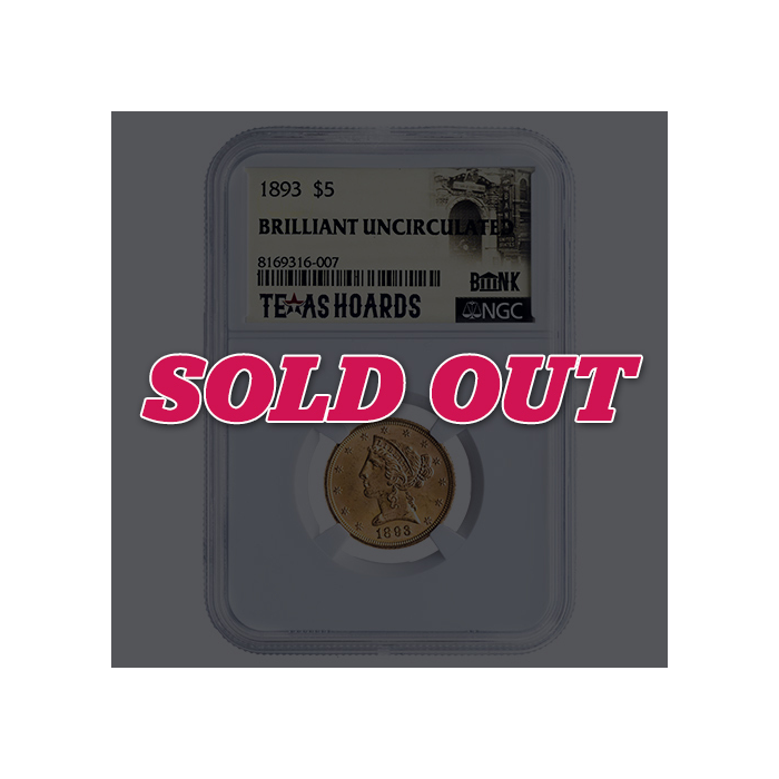 Today, SD Bullion offers the opportunity to purchase 1893 $5 Liberty Half Eagle Gold Coins, certified as NGC BU coins and sealed with NGC Texas Hoards Label.