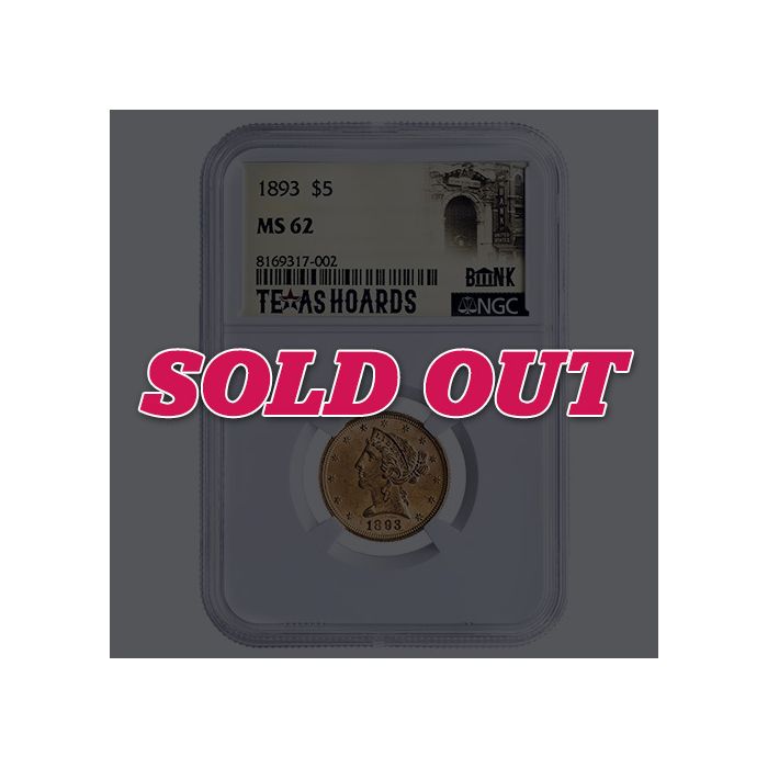Purchase the 1893 NGC MS-62 $5 Liberty Half Eagle Gold Coin - Texas Hoard Label online, 24/7, from SD Bullion.