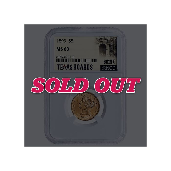 At SD Bullion, you can find 1893 $5 Liberty Half Eagle Gold Coins, graded as MS-63 and sealed with the NGC Texas Hoards Label.
