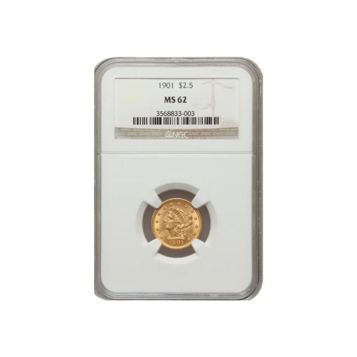 Today, SD Bullion offers the 1901 NGC MS-62 $2.50 Liberty Head Quarter Eagle Coin, encapsulated and graded as MS-62 by NGC.
