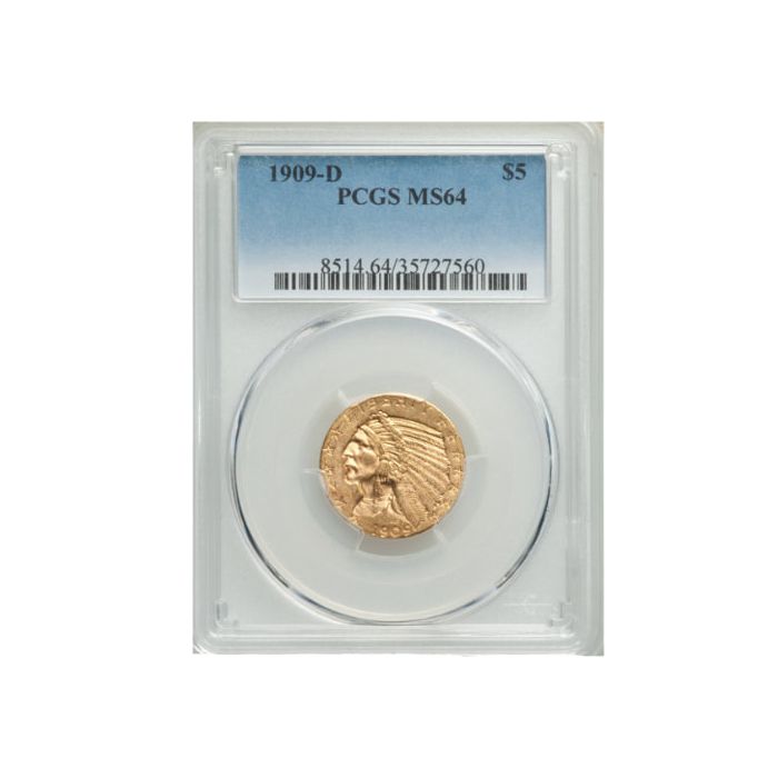 Acquire the 1909-D PCGS MS-64 $5 Indian Head Half Eagle Gold Coin at SD Bullion