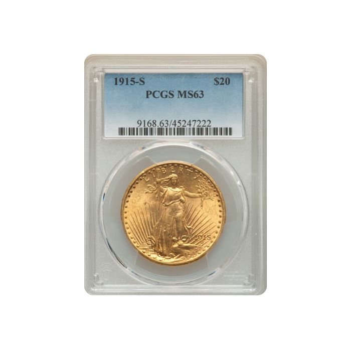 This 1915-S St. Gaudens Double Eagle has been graded MS-63 by PCGS (Professional Coin Grading Service), indicating a coin with strong mint luster, above-average strike, and fewer contact marks compared to lower-grade examples.