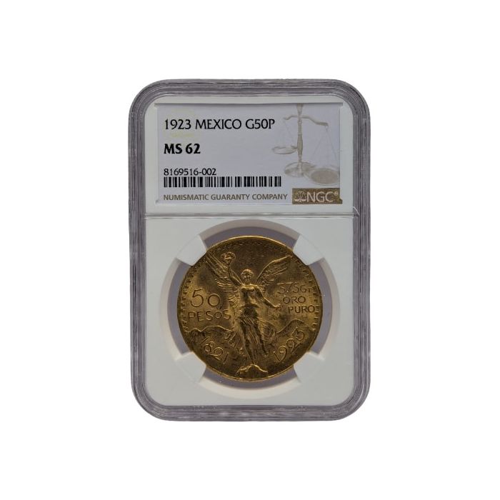 SD Bullion offers the 1923 Mexican 50 Pesos Gold Coin, which has been sealed and certified by NGC as an MS-62 coin.