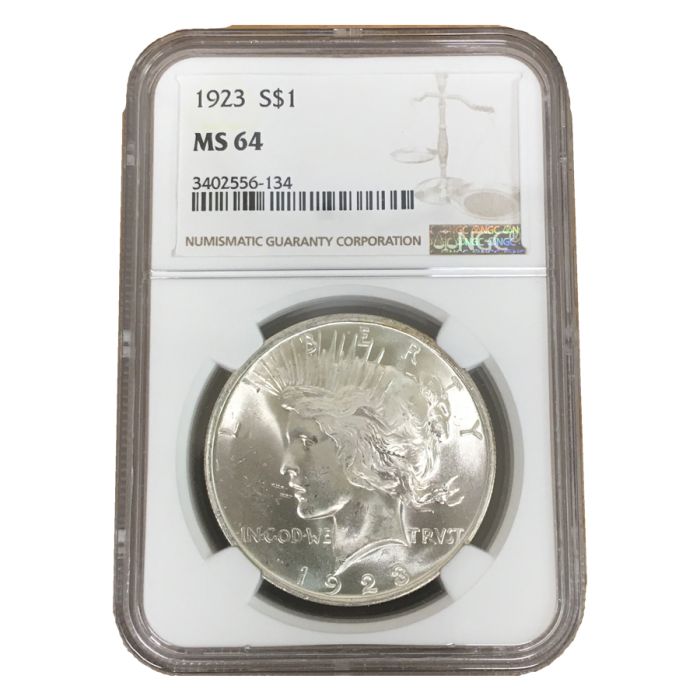 The Peace Silver Dollar is one of the most commonly collected series of US Mint Silver coins. Graded Mint State 64 by NGC*, this high grade 1923 Peace Dollar is a great example of the date and a perfect coin to add to your collection. This series is sought after because of it’s arresting design and short run of production. It was minted for only 10 years, 1921-1928, then again briefly in 1934 and 1935. Putting together a date set is relatively easy compared to say the Morgan Dollar which was minted for 28 years.