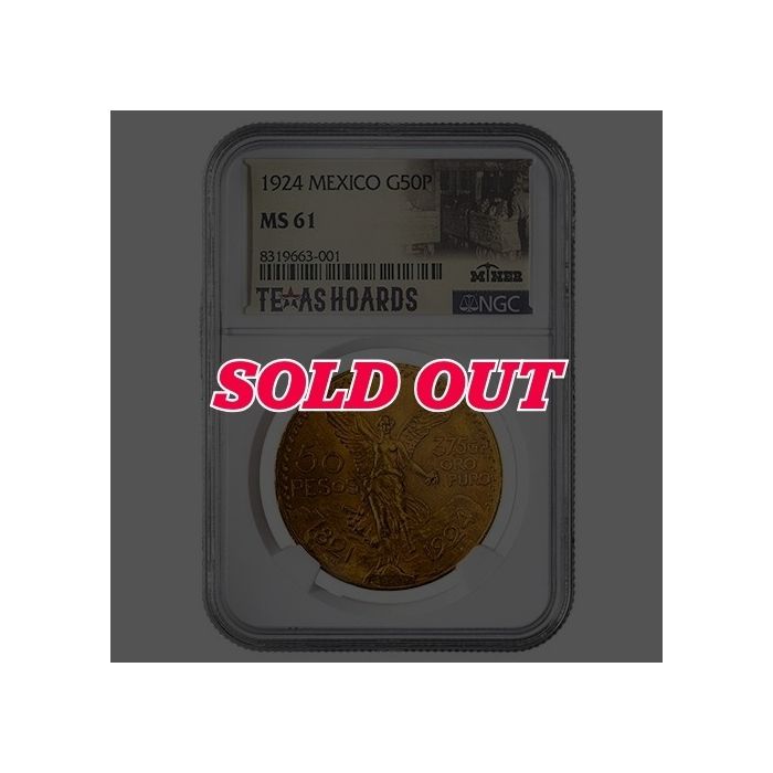 Purchase the 1924 NGC MS-61 Mexican 50 Pesos Gold Coin - Texas Miner Hoard 24/7 online from SD Bullion.