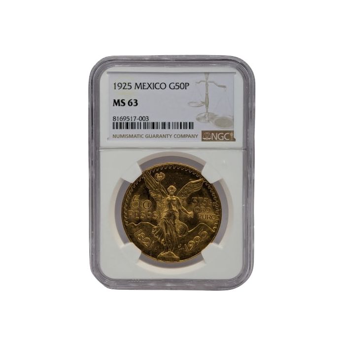 At SD Bullion, you can find 1925 Mexican 50 Pesos Gold Coins, sealed and certified by NGC as an MS-63 coin.