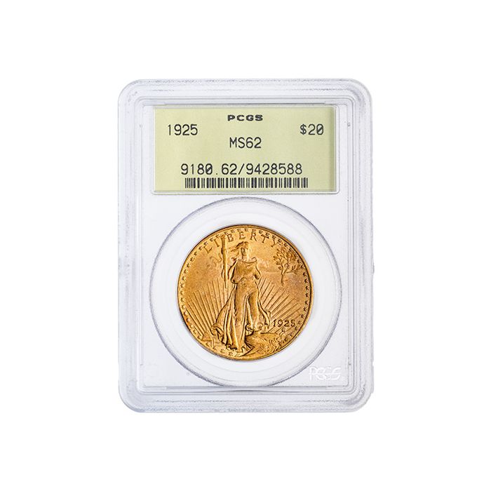 You can acquire 1925 $20 St. Gaudens Double Eagle Gold Coins graded as MS-62 and sealed in the rare Old Green Holders, which PCGS used to encapsulate coins from 1989 to 1998 at SD Bullion.