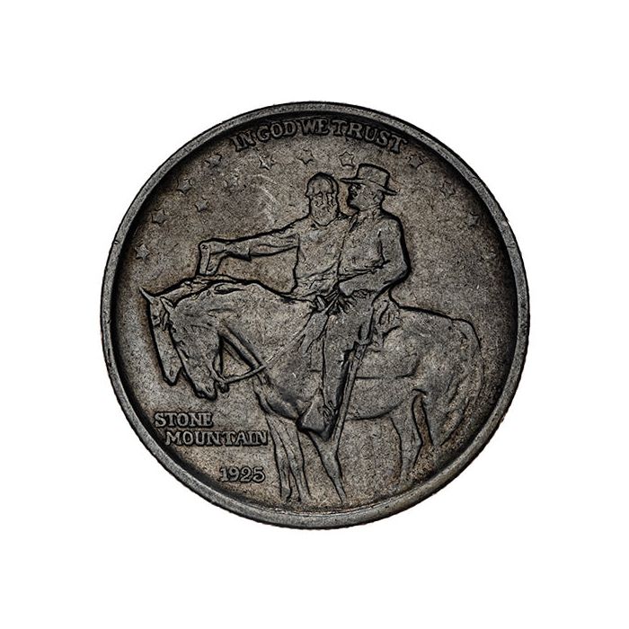 The obverse depicts Generals Robert E. Lee and Stonewall Jackson on horseback, with the motto “IN GOD WE TRUST” engraved at the top and flanked by stars. “STONE MOUNTAIN” and “1925” are inscribed on the lower left.