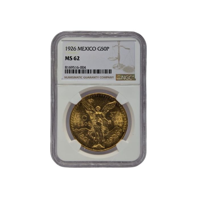 At SD Bullion, you can acquire the 1926 Mexican 50 Pesos Gold Coin, sealed and certified by NGC as an MS-62 coin.