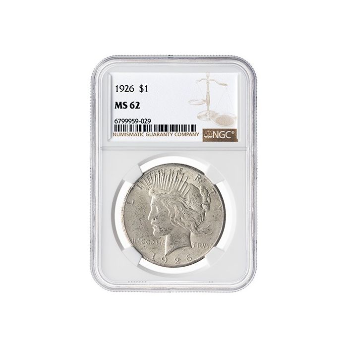 SD Bullion offers 1926 Peace Dollar Silver Coins sealed in NGC slabs and certified as MS-62 coins.