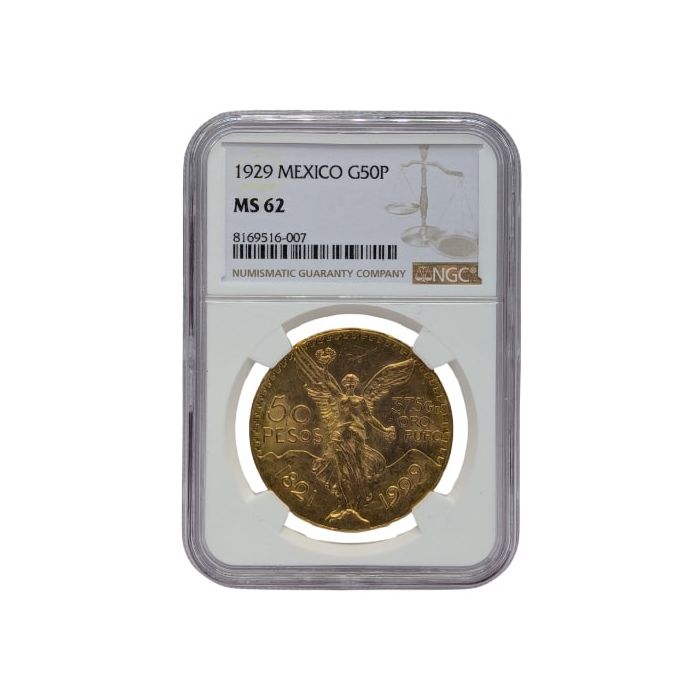 Today, SD Bullion offers the 1929 Mexican 50 Pesos Gold Coin, which has been sealed and certified by NGC as an MS-62 coin.