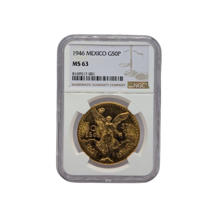 At SD Bullion, you can purchase 1946 Mexican 50 Pesos Gold Coins, sealed and certified by NGC as an MS-63 coin.