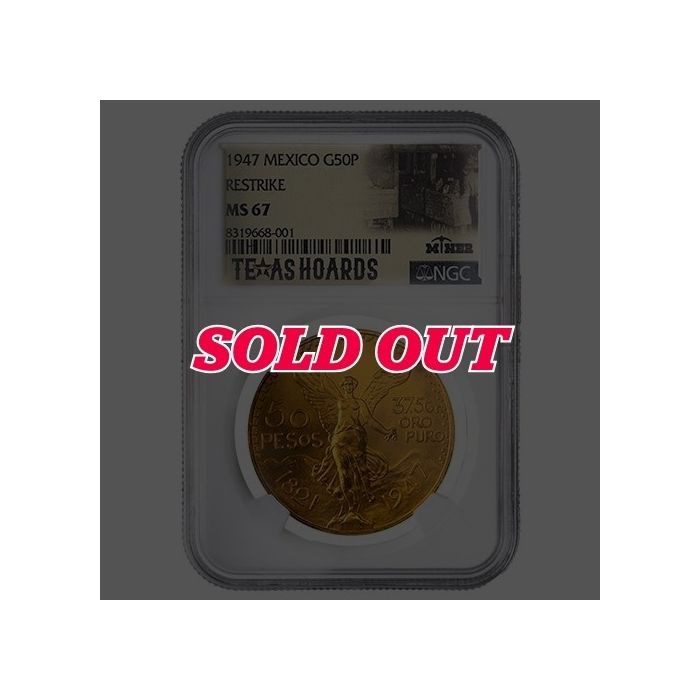 Purchase the 1947 NGC MS-67 Mexican 50 Pesos Gold Coin (Restrike) - Texas Miner Hoard 24/7 online from SD Bullion.
