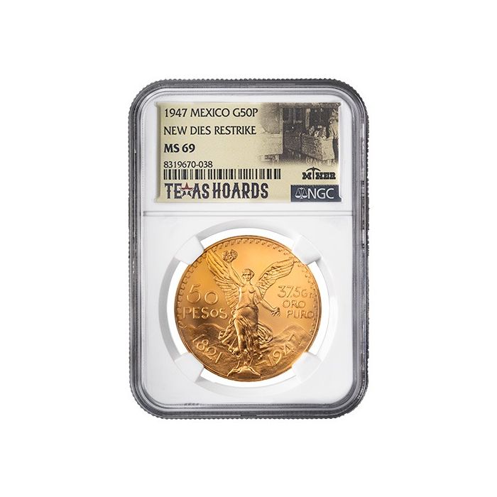 Purchase the 1947 NGC MS-69 Mexican 50 Pesos Gold Coin (New Dies Restrike) - Texas Miner Hoard 24/7 online from SD Bullion.