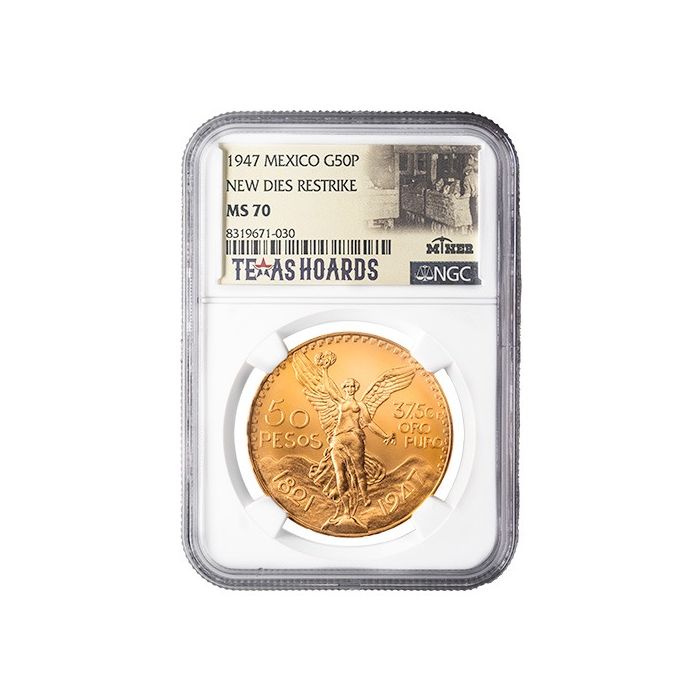 Purchase the 1947 NGC MS-70 Mexican 50 Pesos Gold Coin (New Dies Restrike) - Texas Miner Hoard 24/7 online from SD Bullion.
