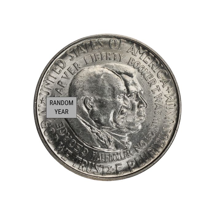 On the obverse, the coin presents overlapping portraits of Booker T. Washington and George Washington Carver. Surrounding the portraits are multiple inscriptions, including “UNITED STATES OF AMERICA,” “IN GOD WE TRUST,” “E PLURIBUS UNUM,” “LIBERTY,” “HALF DOLLAR,” and the year of mintage along with the names of both honorees.