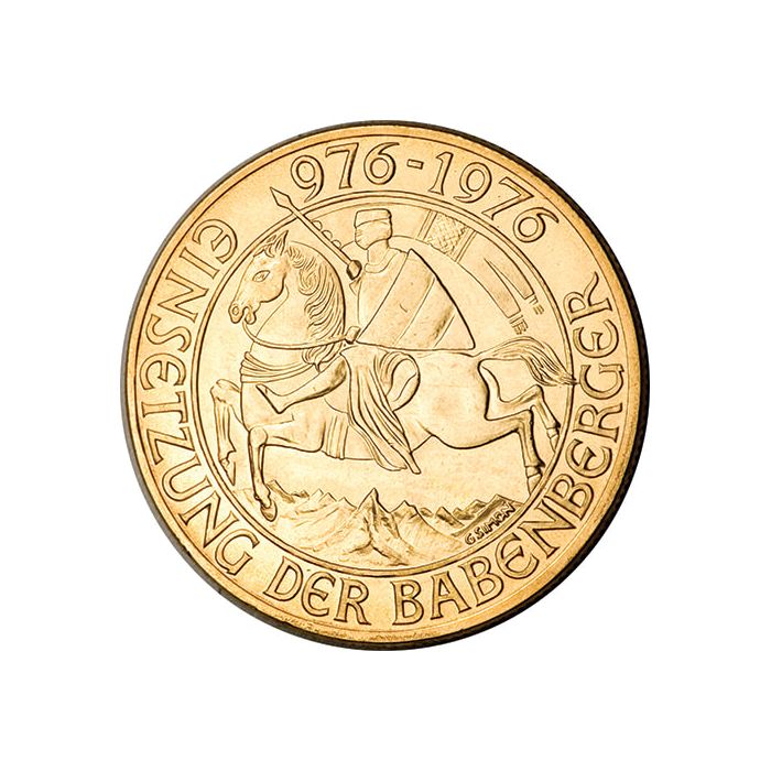 The reverse depicts the seal of the Duke Frederick II, the Duke of Austria as well as a military leader before he died in battle in 1211, simultaneously ending the rule of the House of Babenberg. He is depicted on the coin upon horseback charging valiantly forward with a spear and flag in hand. Above him are years from the to the 1000th anniversary of the start of the Babenberg dynasty, “976 - 1976” and below him is struck “Einsetzung der Babenberger” translating to Babenberg Dynasty.