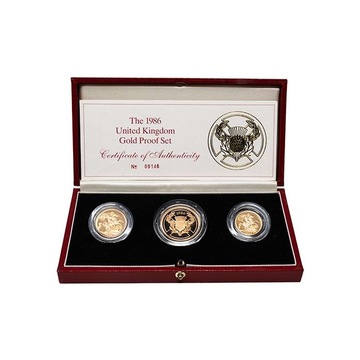 The 1986 Gold Sovereign 3-Coin Proof Set housed in an original mint box with a Certificate of Authenticity is available for purchase now at SD Bullion.