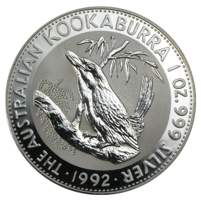 The reverses of these coins bear 1992’s famed Kookaburra design – rendered by John Bergdahl. The cheeky bird, native to Australia, is seen staring upwards intently as it sits perched on a tree branch. This image is surrounded by the name of the coin, year of issue, and the weight and purity of the silver in the coin.
