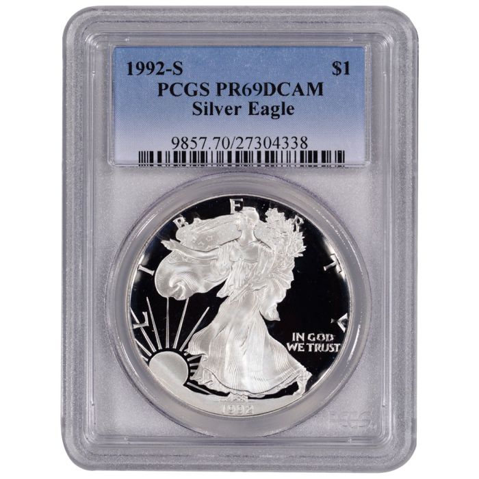 Today, SD Bullion has 1992 1 oz American Silver Eagle Proof coins in stock, sealed in PCGS slabs and graded as PR-69 samples.