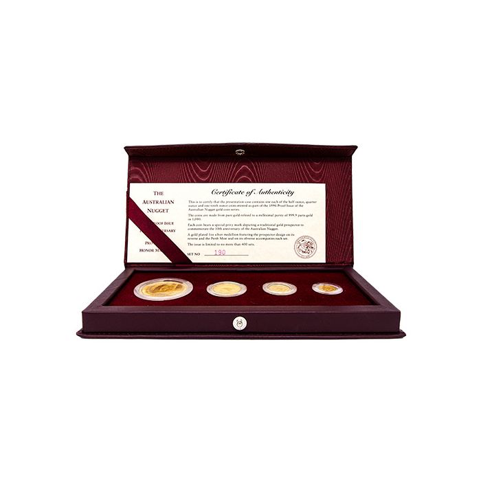 Celebrating the 10th Anniversary of the Australian Gold Nugget's first release, the Australian Perth Mint prepared a commemorative edition of the 1996 Australian Gold Nugget Proof 4-Coin Set.