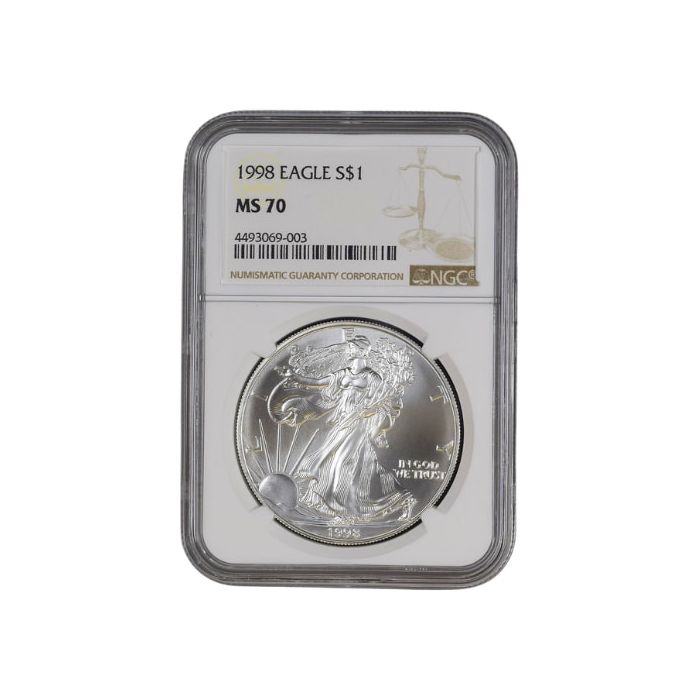 Today, SD Bullion offers 1998 1 oz American Silver Eagle Coins, certified as MS-70 and sealed in NGC slabs with its Brown Label.