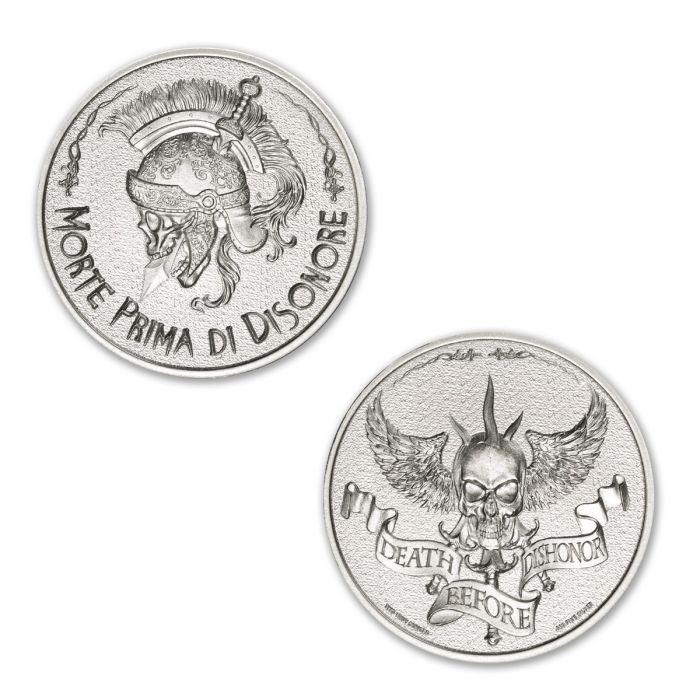 The obverse of this Two Ounce Morte Prima Di Disonore Silver Round features a sword piercing the helmet, exiting through the skull's mouth. Minted on either side of the skull are crosses, while this round’s namesake, "MORTE PRIMA DI DISONORE" is minted at the bottom.