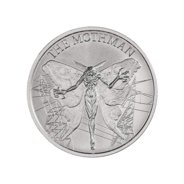 This Mothman Round is minted by Intaglio Mint using two troy ounces of .999 silver bullion. The origin of the Mothman is credited to five cemetery employees who on 12 November 1966 observed something which they identified as a "brown human being," flying from tree to tree over their heads in Clendenin, West Virginia. It was the first recorded observation of the Mothman, an elusive creature, which is now commonly celebrated by the town which it once terrorized but remains as mysterious as it was that night.