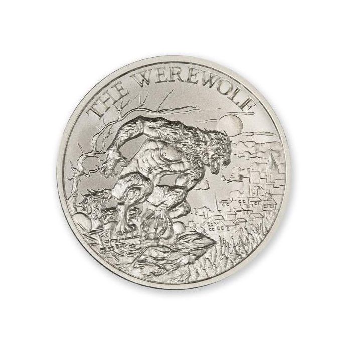 The obverse of these silver rounds features a Werewolf on the edge of a cliff roaring into the night. Behind the creature is a forest, an old English town with stone castles, and a full moon in the sky. Above the animal are the words “THE WEREWOLF”.